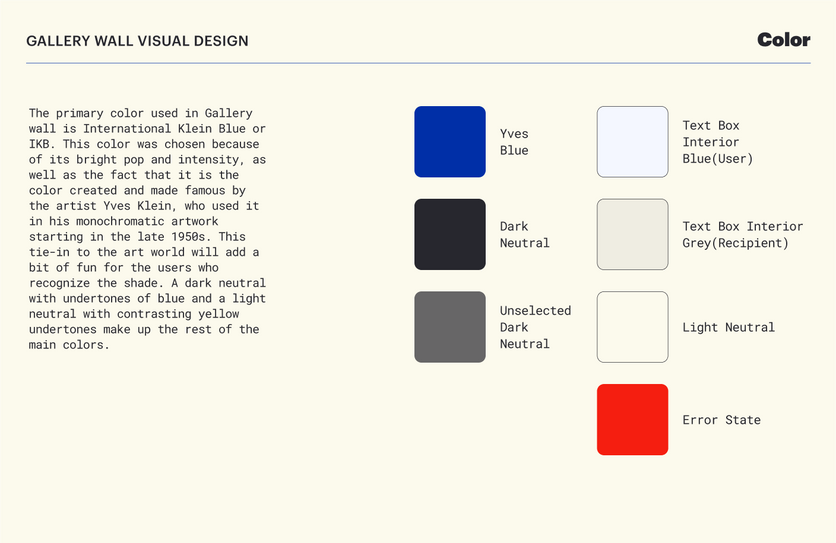 For consistent visual design, a component library of the basic essential elements used in the product was assembled. All of the elements created work together to create an atmosphere of artistic expression and streamlined simplicity.